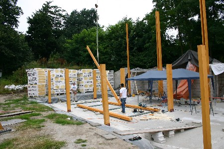 Vandaag de wangen aan de achterste, langste, staanders gemaakt. Op alle staanders de hoogte afgetekend. Morgen de staanders op hoogte zagen en de rest van de wangen boren. Hopelijk kunnen morgen de eerste liggers er op. Vanavond de gehele bouw en materiaal afgedekt omdat het mogelijk gaat regenen.