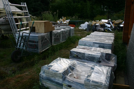 Afgelopen weekeinde allerlei klusjes gedaan. De platen gemaakt voor onder het keukenraam, begonnen met de platen voor onder de zuidgevel en de rabbatdelen naast het keukenraam gemaakt. De anhydrietvloer begint te drogen Ben er alleen niet zeker van dat deze in drie weken droog is. Vandaag werd de boring van de warmtepomp gemaakt. Eersty werd er een boring van 9 meter gemaakt die gebruikt kon worden voor water voor de andere boring en in de toekomt om de tuin te beregenen. Daarna werd begonnen met de boring van 80 meter. De eerste 9 meter was zand, daarna tot 21 meter zand leem en tussen 21 en 80 meter was het puur leem. Omdat onze woning weinig energie nodig heeft is deze ene boring genoeg. In de toekomst hoeft de bron zelfs minder te doen omdat de zonnecollectoren veel van de warmte gaan verzorgen. Op de bron gaat ook gekoeld worden. De bron word gevuld met fijn grind.