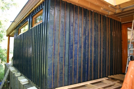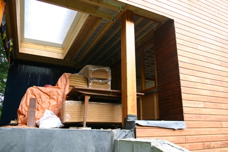 De Noordgevel is op een laatste latje af. De dakbedekking en de rand is ook afgewerkt. Mijn vrouw is bezig de gevel voor de tweede keer in de blauwe lijnolie te zetten. In de douche de wand van de douchekraan gemaakt. Verder het frame van de doiuchevloer gesteld en de warmteterugwinning van de douchebak. Morgen verder.