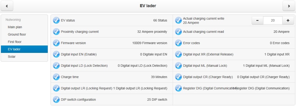 Eerste deel van huis smart EV lader gereed. De EV laadpaal controller is gekoppeld aan de domotica controller (huis Smart Grid controller). De huis Smart Grid controller kan nu het laden van de EV beïnvloeden. In eerste instantie om te voorkomen dat de 25 Ampere huisaansluiting er uit gaat door overbelasting in combinatie met de slimme meter DSMR4. Later worden geavanceerde toepassingen toegevoegd als laden afhankelijk van de PV opbrengst en beprijzen per kwartier.